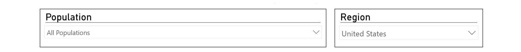 - Within a report page, you can use the drop-down menus to filter available data by a different Population and Region without returning to the home page. The charts will update based on the Population and Region selected.