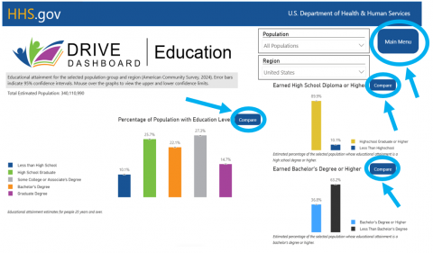 The U.S. Department of Health and Human Services (HHS) Office of Minority Health (OMH) Data Resources and Integrated Visualization Ecosystem (DRIVE) is an interactive data visualization dashboard that integrates several measures from the U.S. Census Bureau’s American Community Survey (ACS) across population groups.