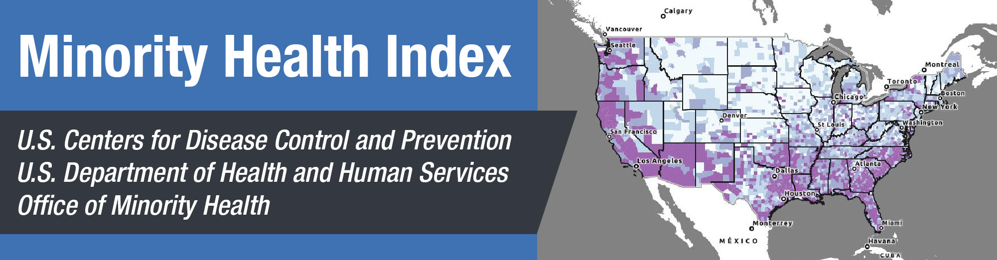 The Minority Health Index (MHI) is a database and mapping tool developed by the U.S. Department of Health and Human Services (HHS) Office of Minority Health (OMH) and U.S. Centers for Disease Control and Prevention’s Agency for Toxic Substances and Disease Registry (CDC/ATSDR). The Minority Health Index enhances existing resources to support the identification of racial and ethnic minority communities where public health emergencies may have a disproportionate impact and adverse outcomes.
