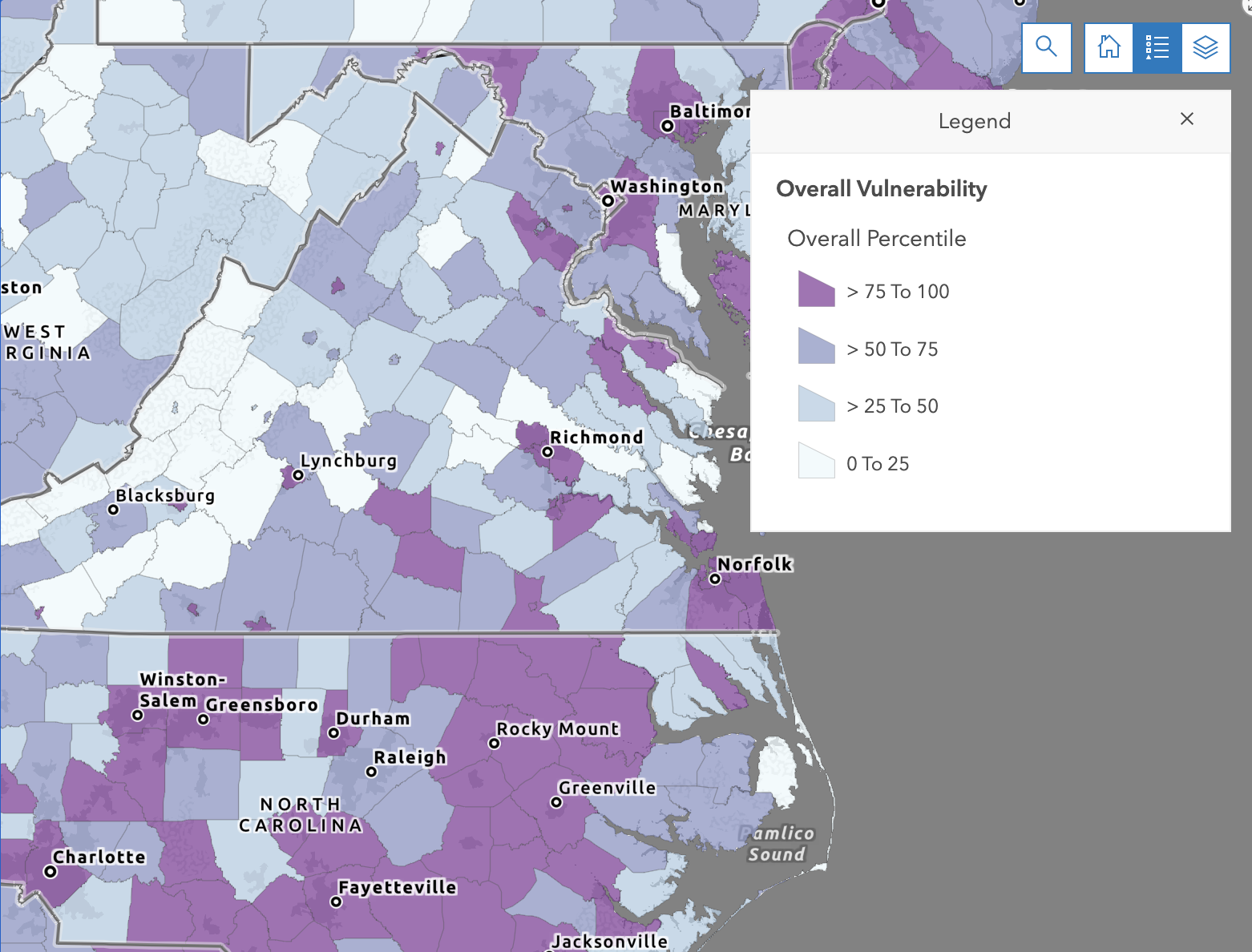 Within the dashboard, users can customize the bar chart through a drop-down menu of variables and can filter the data by state, county, and MHI percentile ranking. For example, if a user selects the “%Below 150% of poverty line variable” and filters to Georgia and All Counties in the top 20 percent for Theme 6 (Health Risks), the chart updates to display the “%Below 150%” of poverty line, the overall vulnerability score and Theme 1 (Socioeconomic Status) in those counties. This interaction makes it possible to look at a subset of counties based on different factors contributing to vulnerability and explore how individual variables change accordingly.