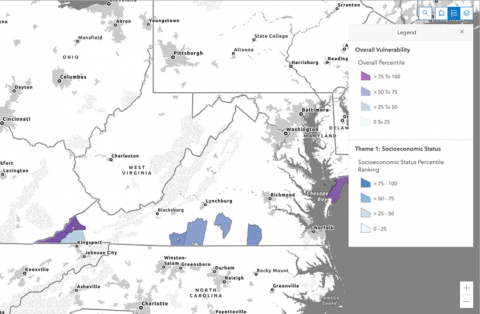 User interaction with the dashboard map can begin with either search criteria or a geographic area of interest. When the user selects a subset of counties with the filter function, the map updates to show only those counties. In this way, a user would be able to identify which counties in Virginia are ranked highest for Medical Vulnerability. Conversely, if a user adjusts the map to focus on a geographic region, the chart will update to show the statistics for counties currently visible on the map.