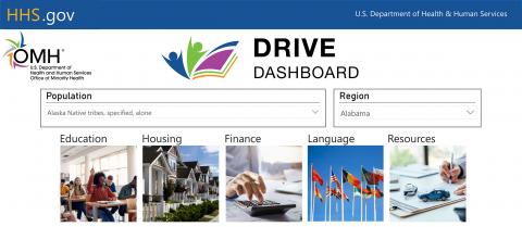 OMH DRIVE is an interactive online dashboard that presents data visualizations (i.e., bar charts) to observe the distribution of five factors – Education, Housing, Finance, Language, and Other Resources – within racial and ethnic populations and various regions.